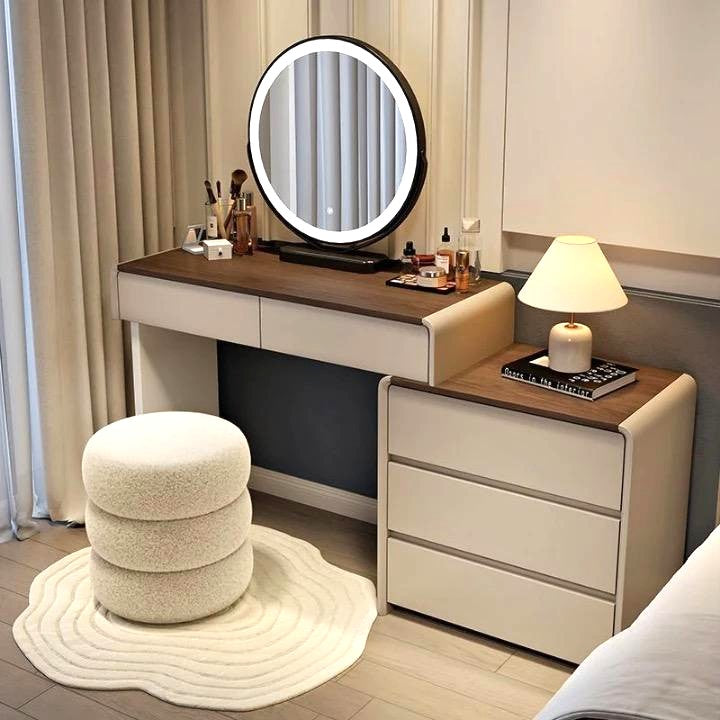 Upgrade your bedroom or dressing space with this sleek modern vanity table. Featuring a large round LED mirror with touch control, this vanity ensures perfect lighting for your makeup routine. The tabletop offers ample space for cosmetics and accessories, while the combination of top drawers and a side cabinet with three deep drawers provides generous storage. it blends functionality with contemporary elegance—perfect for any modern home.