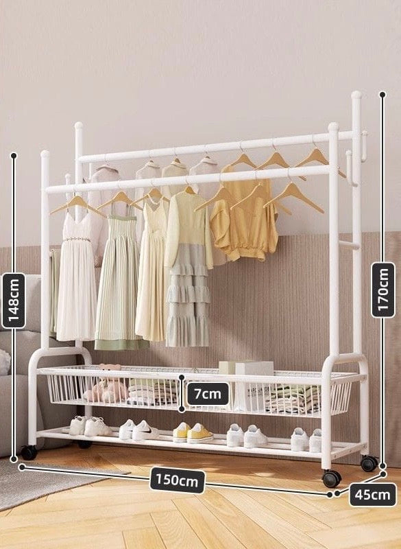 حامل ملابس متعدد الأغراض مع تخزين للأحذية - شماعة ملابس معدنية شديدة التحمل مع قضبان مزدوجة وعجلات قفل - منظم موفر للمساحة للملابس والأحذية والإكسسوارات - شماعة - رف